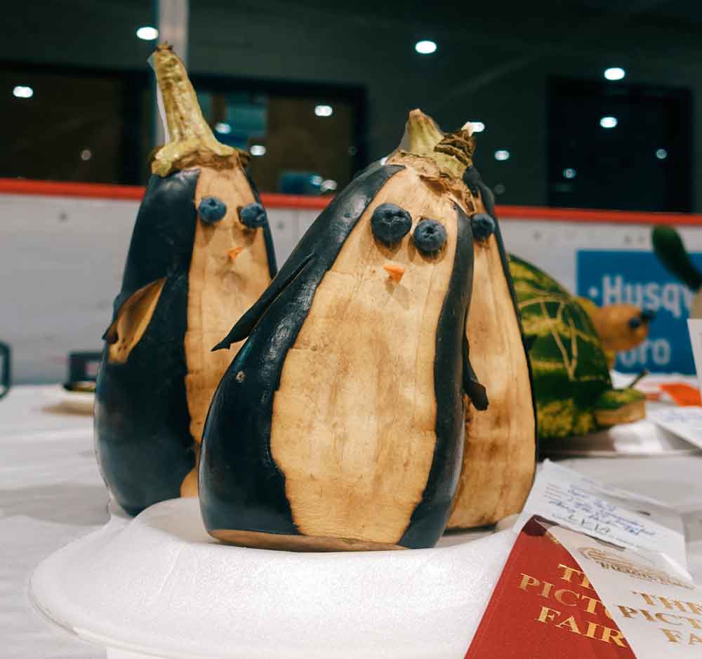 The hockey arena has long tables laden with all the fruit, vegetable and flower competition entries. At the side, safely behind glass, the pies, cakes and preserves sit temptingly, with the ribbons they have won. In the curling rink there is the dog show in which dogs compete for longest tail, cleverest trick, best costume while at the other end, the arm wrestling trials go on. Earlier in the day there was a baby contest.