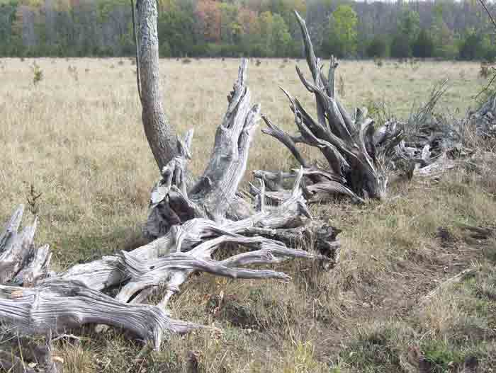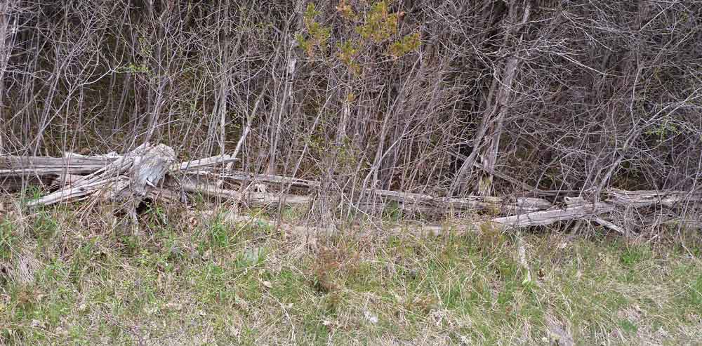 Remnants of an early rail fence. The rails might already have been a hundred years old when salvaged to build the deadman.