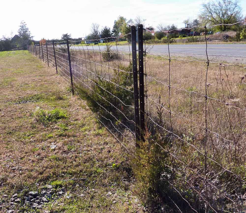 Modern page wire fence with steel posts jackhammered into the bedrock.