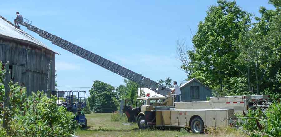 My old barn has been around since the 1860s and has stood up to every storm including hurricanes. So I harried the insurance people and got in the repair folk. I thought they might just fold the roof back in place. But not so. The section has to be dismantled, the ancient axe-hewn rafters put individually back in place and new steel hammered on All by a fellow hanging off the ladder of a retired fire truck.
