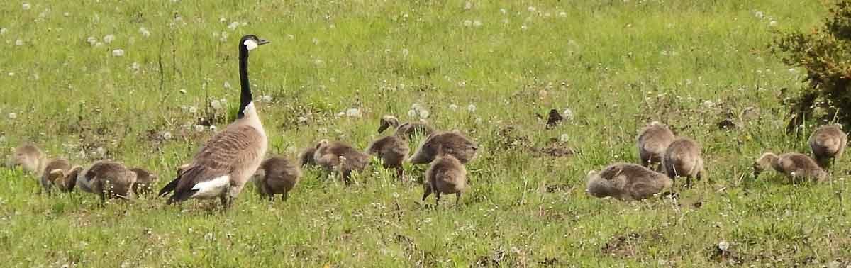 The geese are very protective of their families. When out en masse, there is always at least one long necked sentinel keeping sharp vigil while the rest forage. They are oblivious to traffic unless a vehicle slows. Should a person appear, no matter how distant, they herd their charges back to the safety of the pond as fast as the youngsters can run. Until the babies can fly, they could make an easy lunch for foxes, coyotes and whatever else can move faster than little waddling feet.