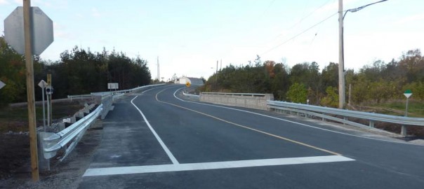 Brand new white lines keep us in our lane and show us exactly where to stop so we can spot traffic speeding up the hill below. Generous shoulders will please bike riders and village folk out for a stroll. Vast stretches of shining safety rail, much more than before, ensure we won’t slide into the deep ditch in the winter and shepherd us into the conservation area at the side. Our sweep of new pavement even has it’s first fast food litter decorating its edge.