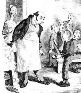 While a properly made gruel can be thick and delicious, the watery version ingested by Oliver hardly constituted an adequate diet.  No wonder the growing orphans were famished, scrawny and subject to every ill including raging infections, killing fevers, typhus and TB.  On the other hand, they were lucky not to be sleeping under bridges and trying to catch rats for sustenance. Charitable institutions of the time, dependent on donations, struggled to provide any kind of regular meals.  So gruel has its honoured place as an alternative to certain starvation.  Please, can we have some more!